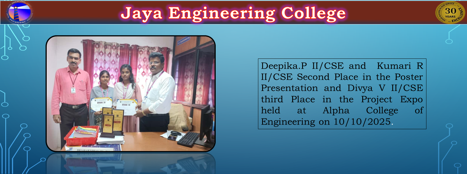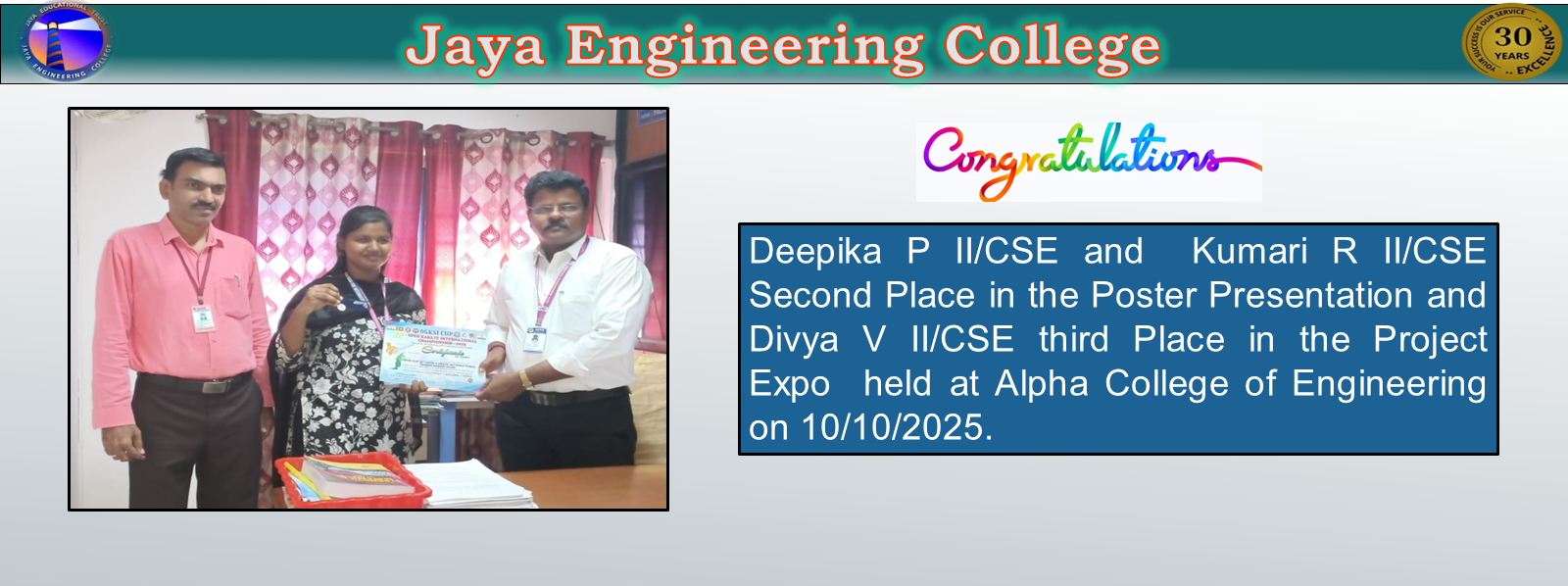 Deepika P II/CSE and Kumari R II/CSE Second Place in the Poster Presentation and Divya V II/CSE third Place in the Project Expo held at Alpha College of Engineering on 10/10/2025.