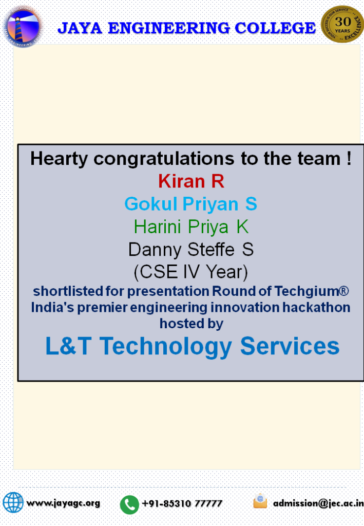 Kiran R Gokul Priyan S Harini Priya K Danny Steffe S (CSE IV Year) shortlisted for presentation Round of Techgium® innovation hackathon hosted by L&T Technology Services